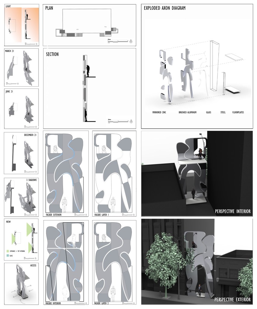 The use of organic forms and straight lines creates a contrast. Also, the materiality is another slightly contrasting element with using silver metal, rough silver metal, and glass in the connecting ridges of the forms. The benefits of having this contrast of forms and materials creates interest. The down side could be that it is harder to understand what is being looked at.